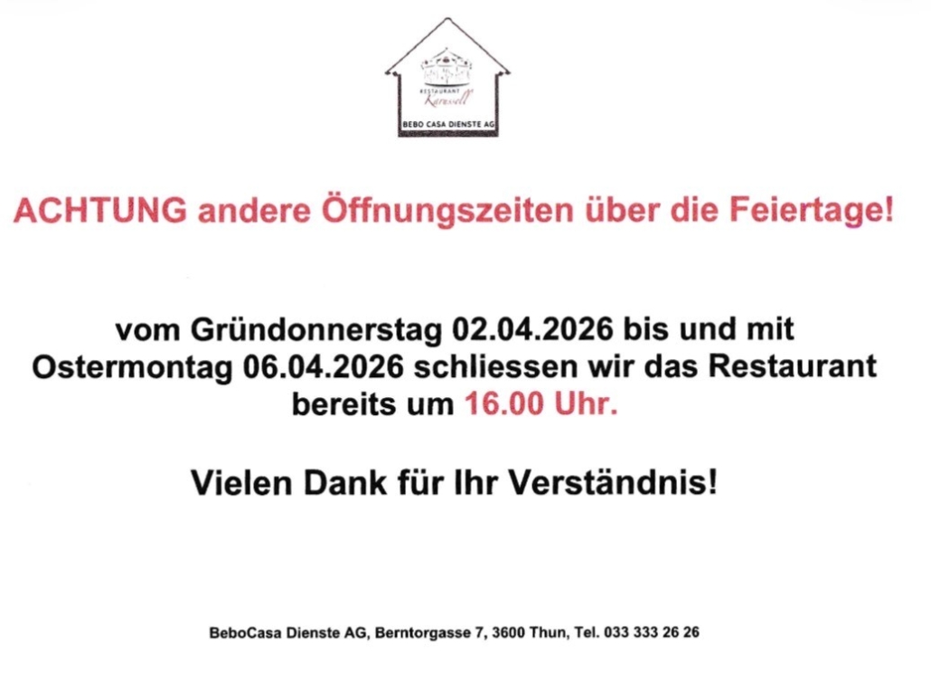Bei uns im Restaurant Karussell in Thun können Sie mittags und nachmittags Schweizer Küche und vegetarische Gerichte in einem schönen Ambiente geniessen.